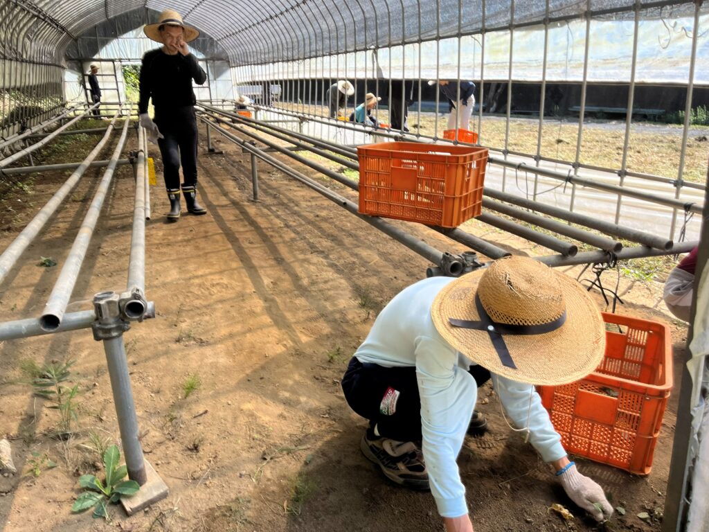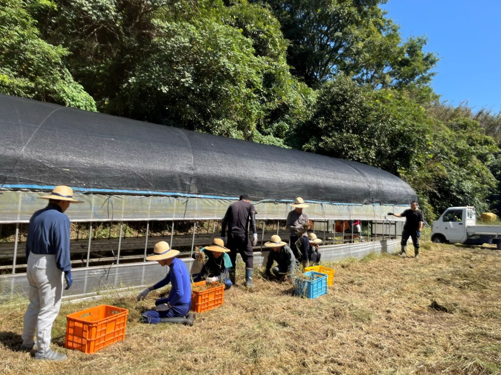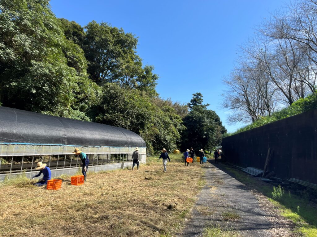 秋らしい青空がひろがった10月初旬、林産班の皆さんはフレーム周りの草刈りや環境整備に勤しんでいました。チーフのU支援員の元気な声が響いていますが、利用者の皆さんは寡黙にもくもくと仕事を進めていきます。「働く大人って素晴らしい!!」働く姿は皆本当に尊いです。